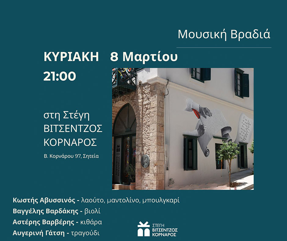 8 Μαρτίου 21:00 Στέγη ΒΙΤΣΕΝΤΖΟΣ ΚΟΡΝΑΡΟΣ (Β. Κορνάρου 97, Σητεία)