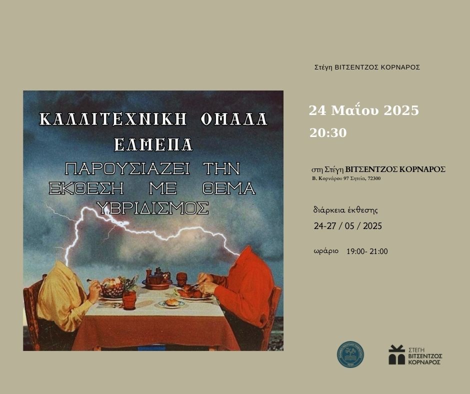 You are invited to join us to the exhibition “Hybridity”, on Saturday, May 24 at 20:30, at the premises of Stegi VITSENTZOS KORNAROS (97, V. Kornarou St., Sitia), an event filled with aesthetic conflicts, unexpected compositions and limitless creativity.