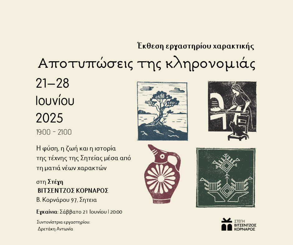 Nature, life, and the history of Sitian arts, as seen through the eyes of the local printmakers of today: Seven participants in the Printmaking Workshop which was held at the Folk – Historical Museum of Sitia from November to June, and the workshop coordinator, Antonia Dretaki, present their work at Stegi VITSENTZOS KORNAROS (97, V. Kornarou St., Sitia), on Saturday, 21 of June, at 20:00.