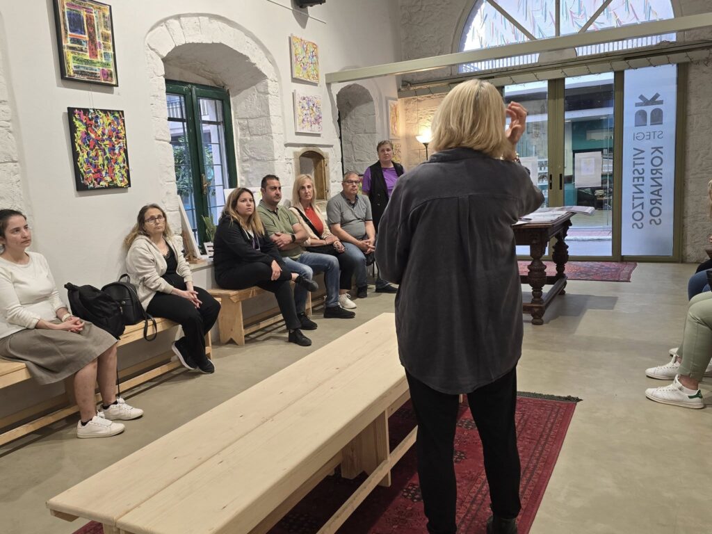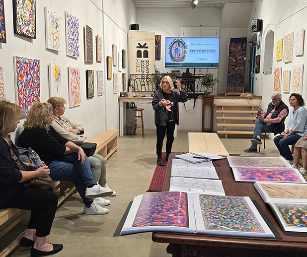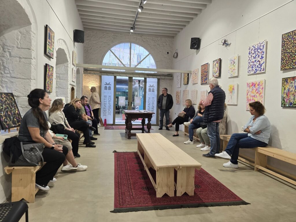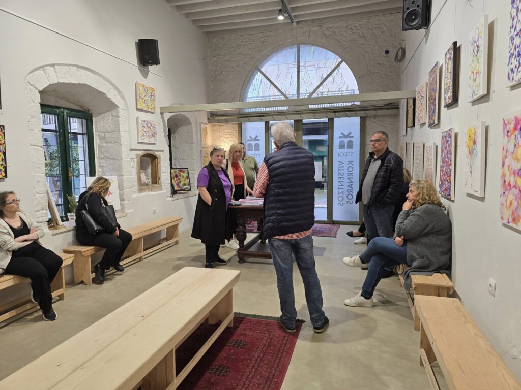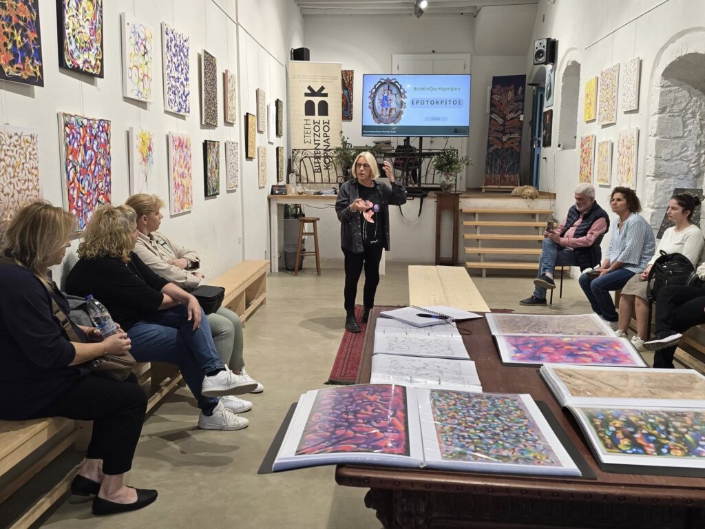 On Thursday, May 15, the trainees and trainers of the Second Opportunity School of Sitia visited the premises of Stegi VITSENTZOS KORNAROS. During their visit, they were informed about the activities of “Stegi”, learned about the life and work of the poet Vitsenzos Kornaros and delved into the content of his most important literary work, Erotokritos. They also visited the art exhibition “Flows and Light” by Patrick Aslanian and had the opportunity to converse with the artist himself, exchanging views on his artwork and the creative process. The visit concluded with an interactive quiz game. Members of the winning team received copies of the comic book Erotokritos, by author Dimitris Papamarkou, while all participants received commemorative notebooks. It was a special day, filled with knowledge, art, and creative interaction.